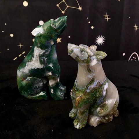 Wholesale Crystal Wolf Carving Animals Druzy Moss Agate Wolf Crafts for Home Decoration